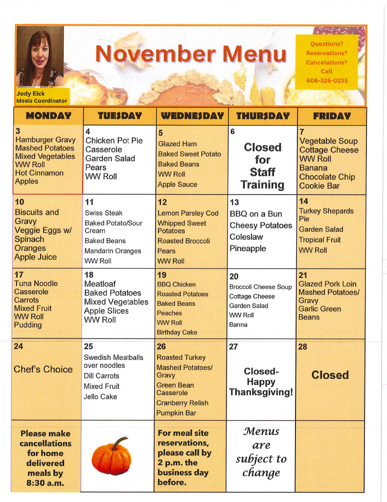 Home Delivered Meals are also provided to the homebound. If you are interested in learning more, call the Aging & Disability Resource Center office at (608)326-0235 to inquire about service in your area.